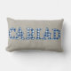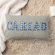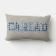 Una divertida almohada lumbar con la palabra galesa 'CARIAD' llena de un patrón de cheque azul bonito en un fondo de color hessiano (burlap). ¡Un regalo perfecto para el que amas!