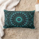 Bring vibrant, calming energy into your home with this eye-catching lumbar pillow. The design features an intricate mandala pattern with a mesmerizing radial symmetry in shades of turquoise and teal against a dark, nearly black background. The mandala design is made up of delicate floral motifs and flowing lines that radiate outward like petals, creating a sense of depth and motion.
