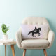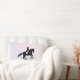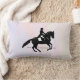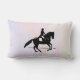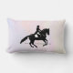 Una almohada con un ilustracion blanco y negro de un jinete. El caballo y el jinete están tocando una pirueta. Elegante y hermoso. Colocado en un fondo acuático de colores pastel delicados y mullidos.