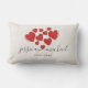 almohada romántica personalizada para recién casados. El elegante diseño incluye los nombres de la pareja impresos en un guión cursivo de bonito y unidos por un corazón agitado. Debajo de los nombres hay una línea que contiene la fecha de boda impresa en una pequeña letra limpia. Los elementos decorativos incluyen una serie de corazones rojos flotando sobre los nombres y una textura de lino.