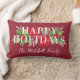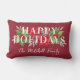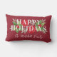 Esta moderna tipografía floral Navidad la almohada lumbar de tiro presenta la redacción "Happy Holidays" enmarcada por un elegante diseño floral y verde acuarela de invierno. Incluye hojas y bayas huecas, flores de poinsettia y ramas de hojas. Personalice el texto del guión con el apellido u otro texto personalizado de su familia. Fondo rojo rico con colores rojo, verde y blanco.