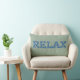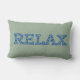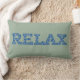 Una divertida almohada lumbar con la palabra "CHILL" en letras llenas de un patrón azul y blanco sobre un suave fondo verde.