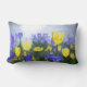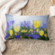 Sunny yellow and blue tulips stand out in a field on a cool, misty spring morning. In the early sunlight they stand out like golden cups of light.