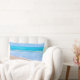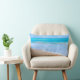 Una almohada lumbar con una fotografía de un océano azul cristalino con olas suaves a lo largo de la orilla del mar y una suave arena marrón. Un cielo azul con nubes onduladas a lo lejos. Sereno paisaje marino idílico tropical.