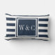 Almohadón lumbar elegante personalizado a rayas azules marino y blanco con un monograma de iniciales cuadradas y negras. Regalo ideal para una boda o una inauguración de casa. Puedes personalizar las iniciales y personalizar el color a tu elección. Diseñado por Thisisnotme©