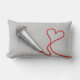 Micrófono plateado con cable rojo en forma de corazón sobre fondo gris