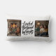 This elegant lumbar pillow features a sophisticated, modern design centered around the heartwarming quote "loved beyond words" in a chic cursive script. Flanking the central typography are two custom photo placeholders, allowing you to showcase a pair of your most precious family memories against a clean, minimalist white background. The elongated lumbar shape provides a unique canvas that turns personal photography into a stylish piece of functional home decor.