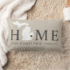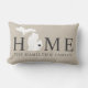 La elegante almohada de bienvenida presenta un diseño de tipografía con texto "Home" y mapa del estado de Michigan. El marcador suave negro / anónimo de la ciudad se puede posicionar sobre la ciudad donde vives a través del Personalizar. Personalice su monograma familiar o el nombre de su ciudad natal. Beige, negro suave y blanco. Un patrón de rayas horizontales se viste por la parte posterior de la almohada.