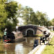 Diseño artístico de una lancha estrecha que se acerca a un candado y a un hombre que pesca. Los barcos del canal, conocidos en el Reino Unido como barcos estrechos, se utilizaron originalmente para transportar mercancías por todo el país. Ahora se utilizan principalmente para el ocio y atraen a personas de todo el mundo para disfrutar de nuestro campo rural. Estos barcos parecen muy bonitos con sus camarotes de colores vivos, azules, rojos o verdes. Flores y diseños de castillo también adornan los barcos más tradicionales.
