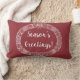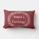 Una almohada lumbar o un colchón festivo con Navidades de hiedra sagrada, hiedra, poinsettias, cono de abetos y brotes de abeto. Esta corona de Navidades dibujada a mano está en blanco sobre fondo rojo profundo, con "Saludos de temporada" en letras decorativas, también en blanco.