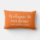 La almohada lumbar moderna naranja y blanca "Bienvenido a nuestro hogar" presenta un texto de escritura elegante con el texto monográfico personalizados sans serif que puede ser personalizado con el apellido de su familia. Se ofrecen tejidos interiores y exteriores para almohadas.
