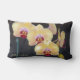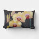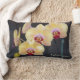 La obra de arte original de ZoeSPEAK en esta almohada lumbar es una fotografía original de las flores de orquídeas, específicamente P. Chain Xen Queen, Yellow/Red Lip. La foto es un armario, una vista detallada de los pétalos de flores amarillo claro que rodean los labios rojos profundos en los centros de las flores. También hay un toque de lavanda antes de que los pétalos se vuelvan amarillos. El fondo de las orquídeas está formado por tonos grises y negros. En las esquinas inferiores del diseño hay palabras en escritura de un color dorado claro. El guión dice "Orquídea Amarilla" a un lado de la almohada, y "Orchidée jaune" (que es "Orquídea Amarilla" en francés) al otro lado de la almohada.