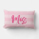 Almohada con "Miss" en escritura de pincel rosa contra fondo de rayas rosadas preppy. Ideal para tu casa o dormitorio. Personalízalo reemplazando el texto del marcador de posición. Para obtener más opciones, como cambiar el tipo de letra y su tamaño, haga clic en el botón "Personalizar". *Tenga en cuenta que la marca de agua Zazzle que aparece en la vista previa del zoom NO aparecerá en el producto impreso final. © Rosewood y Citrus