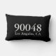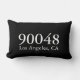 Esta almohada moderna presenta código postal personalizado, ciudad y estado de color blanco sobre fondo negro.