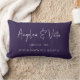 Almohada Lumbar de Recuerdos de Boda de Coordenadas Personalizadas con Escritura Moderna que incluye tus coordenadas y fecha de boda elegidas, nombres de los cónyuges en fuente de escritura informal moderna sobre fondo púrpura oscuro. Gran recuerdo de boda o regalo de aniversario.