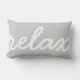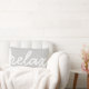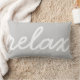 Es hora de enfriar. Nuestra almohada de acento arroja características "relajar" en escritura blanca contra un fondo gris paloma claro.