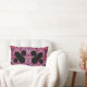 Esta almohada lumbar presenta dos imágenes en espejo de un hermoso arte fractal con el signo del porcentaje negro en un fondo abstracto rojo, rosa y morado.