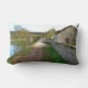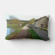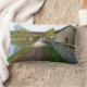 Un canal fluvial a lo largo de un sendero que recorre una muralla rústica de piedra blanca con árboles en ciernes y las montañas al fondo en la campiña francesa Rhône-Alpes.