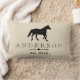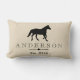 Almohada de tiro lumbar de la silueta negra elegante del caballo con su apellido personalizado y fecha establecida. El fondo es un de color topo neutral y sofisticado con un modelo blanco fino del enrejado.