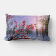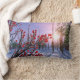 Bayas rojas resplandecientes cubiertas de hielo espumoso contra el telón de fondo de una brillante puesta de sol invernal detrás de árboles desnudos y pinos oscuros.