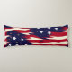 Una representación abstracta vibrante y dinámica de la bandera estadounidense, con rayas rojas y blancas que fluyen, intercaladas con estrellas blancas en un fondo azul profundo. El diseño captura la esencia del patriotismo y el espíritu de libertad.