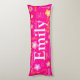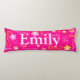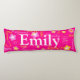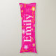 Almohada corporal personalizada de 5 letras con patrón rosa, amarillo y blanco. Personalice con su propio nombre, actualmente dice Emily. El color de fondo también se puede cambiar si se requiere, actualmente rosa. Un regalo perfecto para niñas. Arte y diseño original de Sarah Trett exclusivamente para www.mylittleeden.com solo en Zazzle.