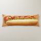 Una almohada del cuerpo con un perrito caliente de mirada delicioso en un bollo imprimió en ella. Lindo y diversión para un salón de recreo o un cuarto de los niños.