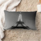 Un cojín rectangular con una fotografía en blanco y negro de la Torre Eiffel a la puesta de sol