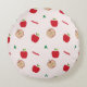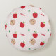 Manzana roja con texto sobre diseño de patrón de fondo rosa.
