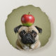 Gracioso Pug con una manzana balanceándose encima de su cabeza.