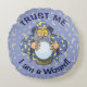 Viejo mago con capa azul mirando la bola mágica de cristal.