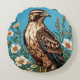 Detalle del busardo común posado entre una variedad de flores vívidas dentro de un marco decorativo circular, exudando una atmósfera de belleza natural y presentación artística.