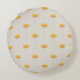 Un campo de amapolas naranjas y amarillas crece en este cojín. La tierra es gris marrón claro.