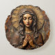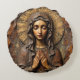 "This striking design presents a portrait of the Virgin Mary as a detailed wood carving or relief sculpture, rendered in rich, warm brown and reddish-brown tones. She is depicted with a tranquil, contemplative expression, hands clasped in prayer, and is framed by a rustic, textured halo. The rough, earthy texture of the wood grain provides a powerful sense of ancient, grounded spirituality. This design is highly suitable for products with a rustic, spiritual, or devotional theme. Imagine it on wooden plaques, religious art prints, handcrafted items, or home decor that evokes a traditional, artisan aesthetic."