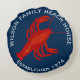 Rojo, blanco y azul, cojín de casa de playa familiar de langosta roja redonda. Personalice con texto curvo e impreso en la parte superior e inferior. Incluya el nombre de la familia y el año de establecimiento. Una gran silueta de langosta en el centro.