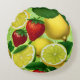 Una vibrante almohada redonda con brillantes limones, limas y fresas en un estilo botánico fresco sobre un fondo verde suave. La paleta alegre y veraniega añade un acento animado a las salas de estar, dormitorios y espacios acogedores de lectura. Una elección elegante para mujeres que aman los motivos frutales, la decoración colorida y los accesorios para el hogar listos para regalar.