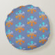 Copos de nieve azules y naranjas sobre un cojín redondo.