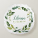 Almohadón redondo personalizado con una hermosa corona de follaje en acuarela sobre fondo blanco. Personalízalo con el nombre de tu bebé u otro texto en cualquier fuente y color. Utiliza las herramientas de diseño para subir tus propias fotos y editar el texto y los colores para que coincidan con la decoración de cualquier cuarto de bebé.