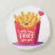 A cute and colorful cartoon illustration of a red French fries carton with a happy kawaii smiling face. The design features a floating red heart and the romantic funny pun quote "I only have FRIES for you". The image has a white sticker border, making it perfect for Valentine's Day greeting cards, fast food lovers, and humorous romantic gifts. Isolated design.