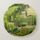 La almohada de tiro redonda con una bobina del zigzag, árbol de ciprés alineó el camino a través de los campos verdes en Monticchiello, Toscana en Italia.