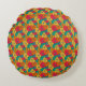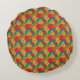 El cuadro muestra un primer plano de una almohada redonda con un patrón floral vibrante. La imagen muestra una almohada redonda, posiblemente un cojín o una prenda de vestir, con un patrón repetido de flores estilizadas. Las flores son amarillas con centros naranjas y están rodeadas de hojas verdes. El fondo de la tela es amarillo claro y hay algunos toques de azul en el patrón. La tela está colocada de manera que el diseño parezca una bola o una esfera. El humor de la imagen es de colores brillantes y alegres y un sentido de repetición lúdica. La iluminación es suave y difusa, con una suave sombra en el fondo. La impresión general es de calidez y vitalidad.
