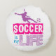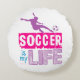 La colorida almohada de tiro al volante del chica con el texto: "EL FÚTBOL es mi vida". Tiene una silueta de chica jugando al fútbol pateando una pelota de fútbol por encima del texto. ©gollygirls.com