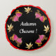 Personalizable, almohada redonda con texto blanco, fondo negro y espalda roja. Esta almohada única presenta un diseño encantador, caprichoso, a mano y digital, textura de Relieve metalizado, bellotas rosas y hojas de otoño coloridas. Gran almohada otoñal para celebrar una ducha de bebé y decorar la sala del vivero. Una almohada perfecta para los chicas que les encanta añadir un toque caprichoso a su habitación. Si el deseo cambia "¡Encantos otoñales! " con su texto preferido.