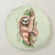 Una almohada redonda con un bonito diseño de acuarela con un bonito perezoso colgado sobre una rama de árbol rodeado de hojas tropicales verdes. Fondo verde oliva claro.