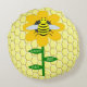 Esta impresionante almohada redonda presenta una imagen gráfica de un lindo abejorro amarillo con rayas negras, ojos, antenas y piernas. Tiene alas azul y blanco bonito. La abeja está sentada en medio de un girasol amarillo dorado. La flor tiene un tallo verde y tres hojas. El mensaje "feliz día de la abeja" aparece esparcido en las tres hojas. El fondo está compuesto por un patrón de abeja amarilla.