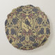 Esta almohada redonda contiene cuervos, libélulas y escarabajos rodeados de flores y hojas en tonos malva y gris sobre un fondo de color tostado.