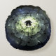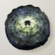 Esta almohada redonda abstracta presenta una flor fractal 3D oscura con pétalos amarillos y puntos negros.