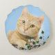 Cojín Redondo Flores blancas y jengibre gato sobre azul claro