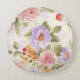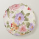 Esta romántica almohada redonda presenta hermosas flores de jardín en tonos suaves rosa y violeta sobre fondo blanco.
