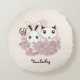 El diseño del producto presenta un conejito y un gatito adorables sosteniendo flores rosas. Este hermoso animal de dibujos animados hace una almohada redonda para niños única y linda con texto personalizado.